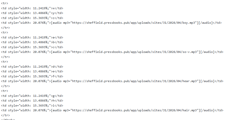 I have an author who wants to embed several MP3 files into a table. The table cells containing the MP3 files get wider each time. It looks fine in the visual editor but not in the preview. I get the same problem if I use TablePress too. See my test example below:
