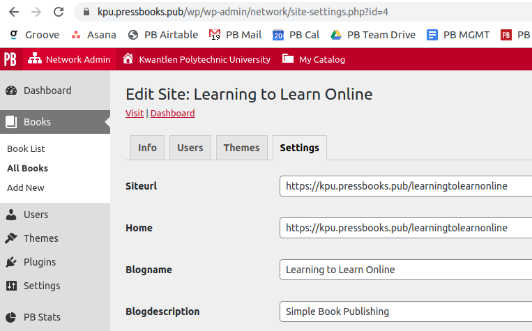 Book administrators can also change this themselves by visiting a ‘hidden’ admin settings page for each book: https://NETWORK.URL/BOOK/wp-admin/options-general.php (replacing network URL and bookname with the relevant values, (i.e. https://kpu.pressbooks.pub/intermediatealgebra/wp-admin/options-general.php). Once there, you’ll see a few options, one of which is ‘tagline’ – this is what’s displayed as part of the book title in the browser bar. As with before, we recommend that users are cautious about editing other information/settings on this page.