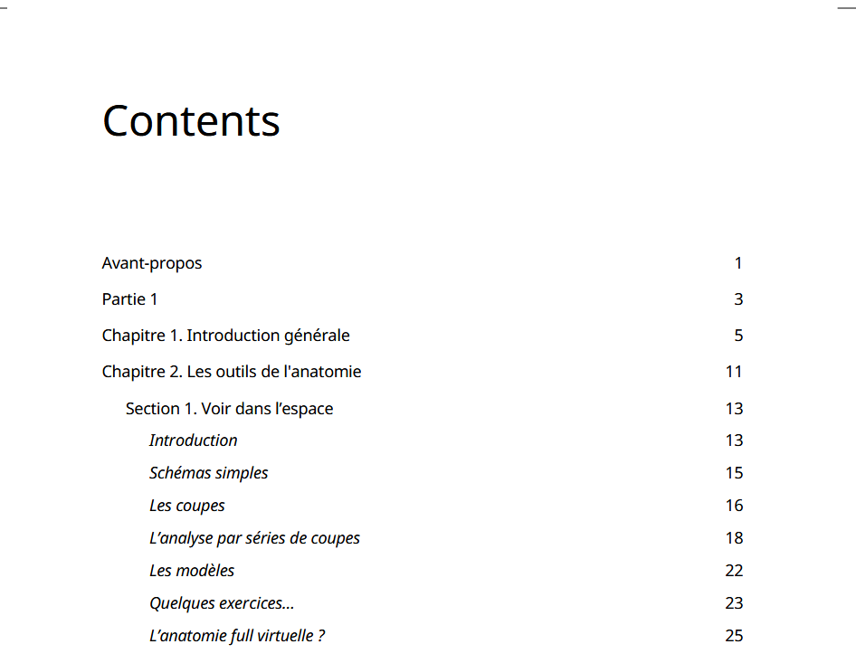 That’s correct : on both EPUB and PDF exports, the title of the TOC is printed in english instead of french. Other pages like the colophon are translated correctly in french but not the TOC. Here is the french version of the TOC :